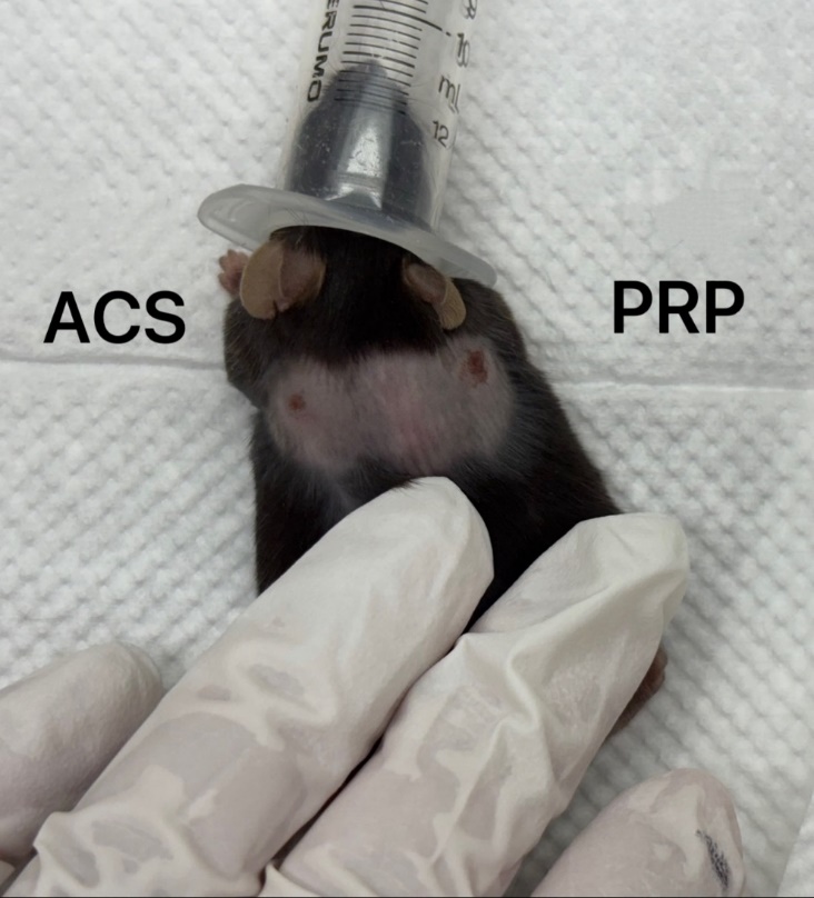 譬如板泌體分泌的表皮生長因子(EGF)是PRP的80倍,在動物實驗中,我們在老鼠胸部製造兩個3mm傷口,每天滴PRP及ACS比較,三天後明顯ACS比PRP好(圖一)。