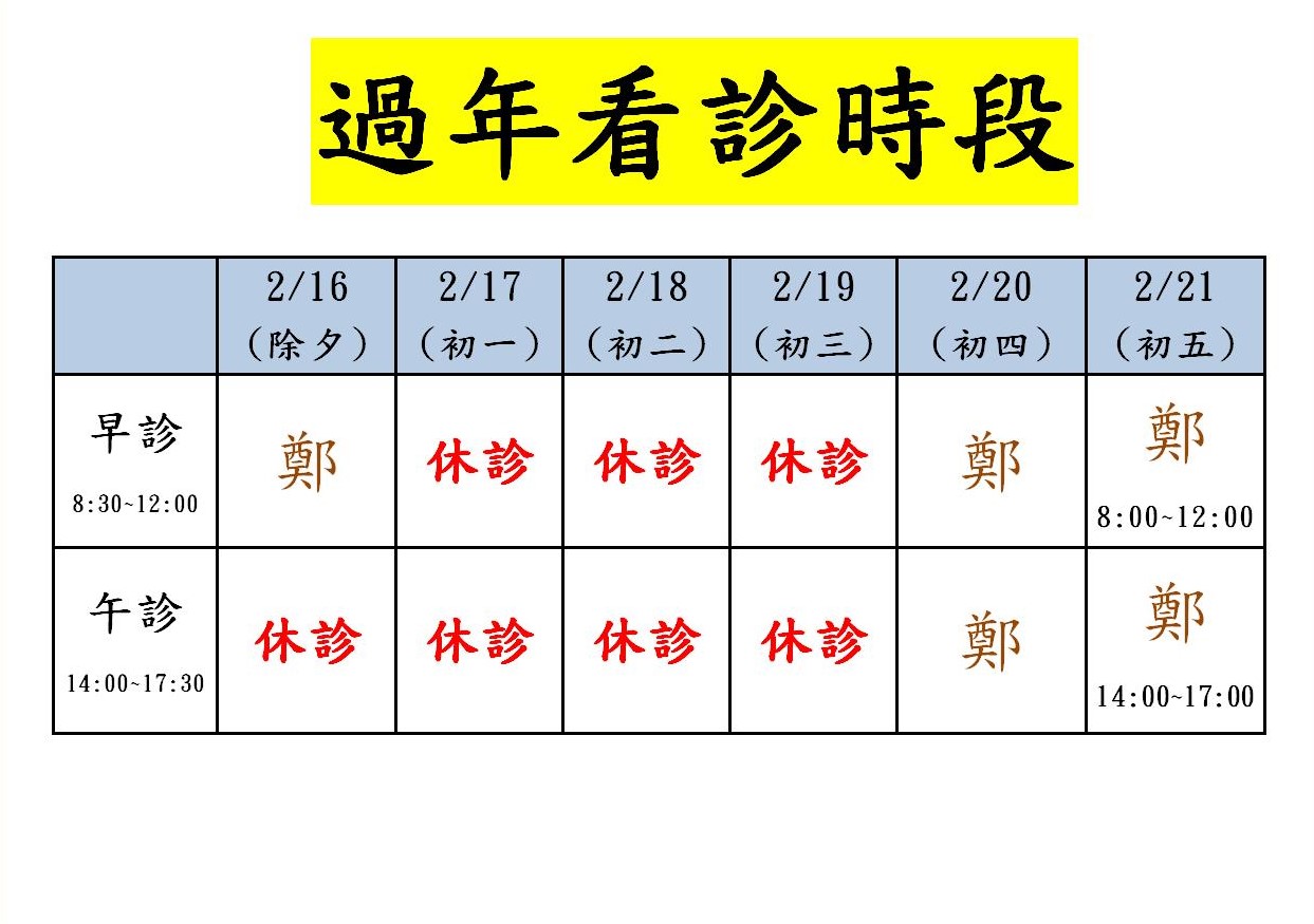 2026春節期間 門診及復健時間表